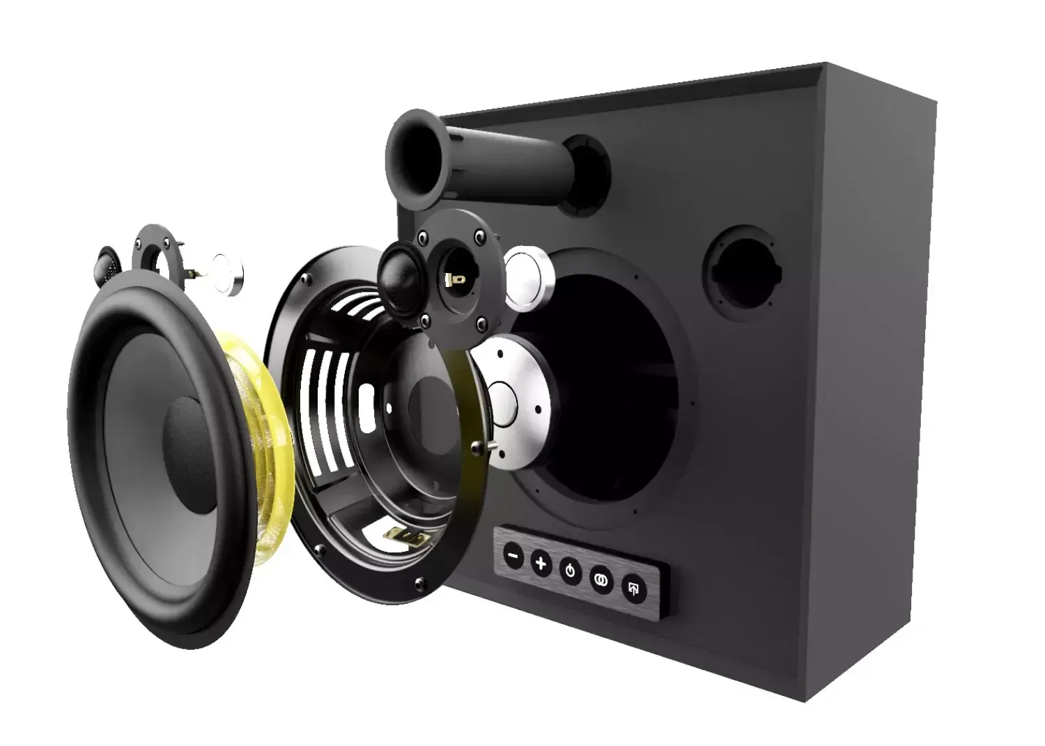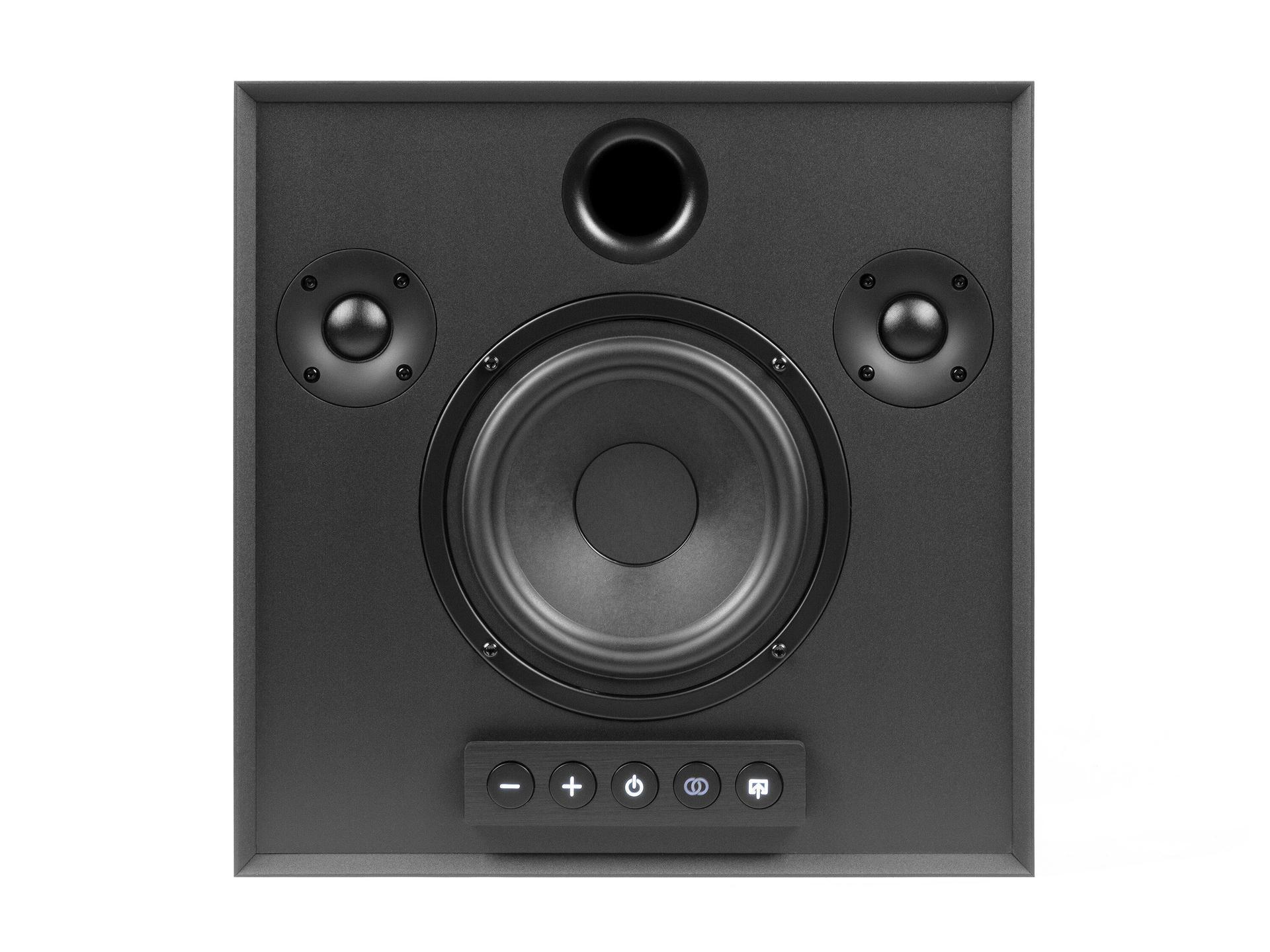 Активная беспроводная колонка в конфигурации 2.1. Плоский корпус для удобного размещения: СЧ-динамик диаметром 6 дюймов с двойным магнитом и два 1-дюймовых твитера с мягким куполом, фазоинвертор на передней панели. Раздельные усилители мощностью по 50 Вт, DSP-обработка сигнала. Bluetooth с поддержкой aptX, вход на разъеме mini-jack. USB-разъем для питания внешних устройств. Габариты (ШхВхГ): 330x330x150 мм.