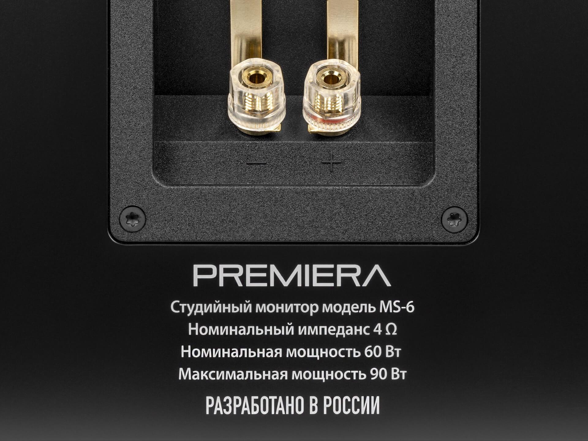 Premiera MS-6 «Studio 6» - двухполосные полочные профессиональные акустические системы с номинальной мощностью RMS 60 Вт. В акустических системах MS-6 установлены два излучателя: дюймовый твитер с шелковым куполом и вуфер диаметром 6.5 дюйма с диффузором из полипропилена. Используется разделительный фильтры 12 дБ/октава по НЧ и 18 дБ/ октава по ВЧ с трёхпозиционным переключателем регулировки частоты разделения. Нормируемый частотный диапазон при неравномерности ±3 дБ составляет 40 Гц — 20 кГц.